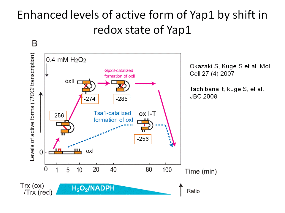 ここでは、タンパク質の中にあるシステインどうしの間に 可逆的なジスルフィド結合を起こすことで過酸化水素シグナルを受容し伝達する現象をレドックスシグナル伝達と呼ぶことにします。上述の研究は出芽酵母 Yap1がその補助因子としてGpx3というタンパク質が働いていることを示したToledanoらの研究を基盤としています。Gpx3はグルタチオンペ ルオキシダーゼに類似な分子として同定されましたが意外にもペルオキシレドキシン活性を持っております。彼らがこの現象を報告をした頃、私たちも、主要ペ ルオキシレドキシンであるTsa1(細胞内のペルオキシレドキシンの94%をしめる)が、Gpx3と同様にYap1の酸化を促進することを試験管内の実験 から明らかにしていました。実際にTsa1にも過酸化水素受容体としての機能はあるのでしょうか?私たちはこの可能性を追求すべく研究を進 めた結果、どうも答えはYesの様です。