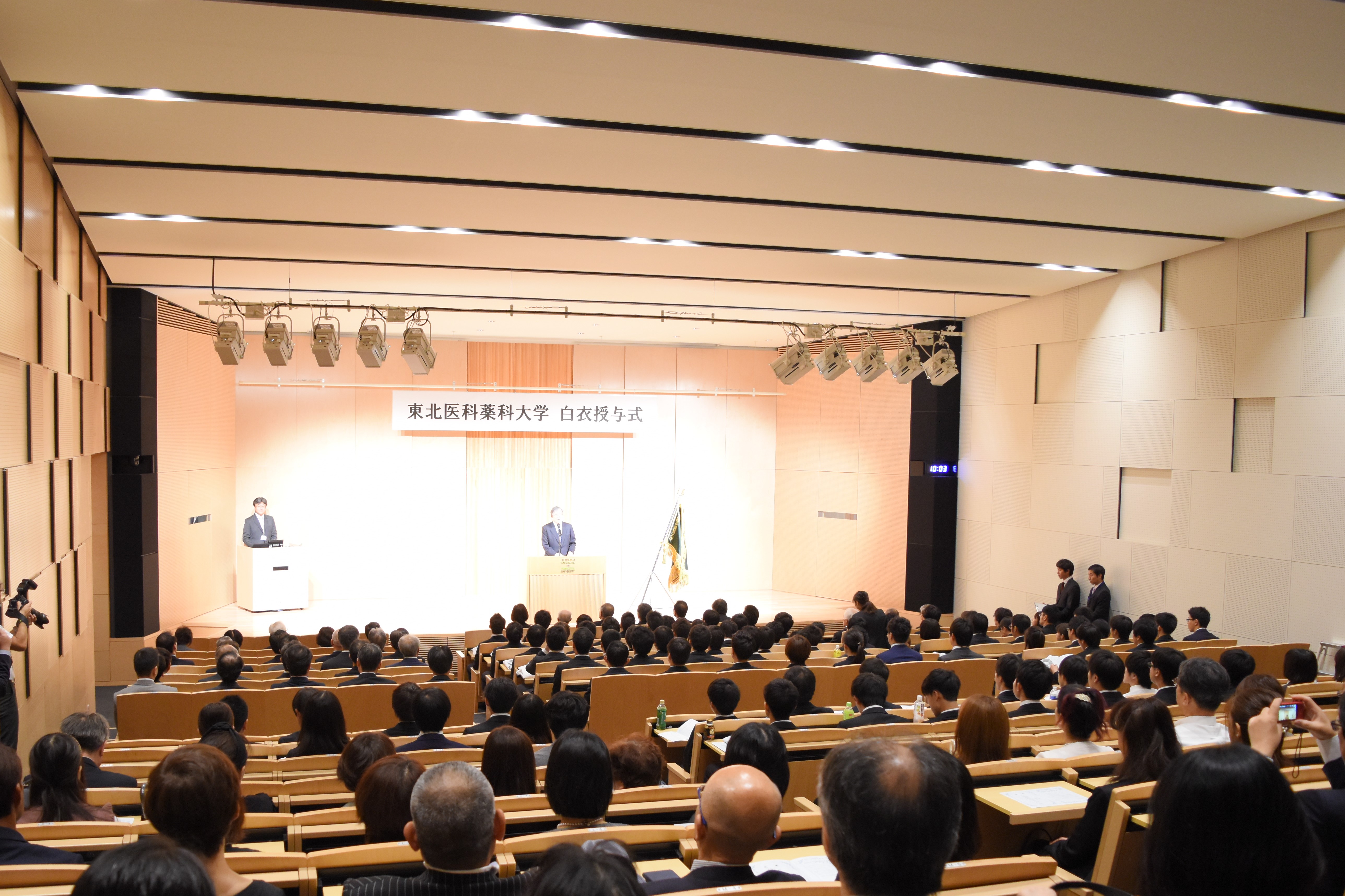 授与式では、高柳理事長・学長及び福田医学部長からの激励の言葉に続いて、1期生96名に白衣が手渡され、全員が本学のロゴ・大学名が入った白衣に袖を通しました。その後、全員で文章を作ったという宣誓文を、代表学生の後藤匡範さんが宣誓し、それを全員が復唱し、「これまで支えてくれた周囲の人々への感謝の気持ちを持ち、臨床実習に参加できることの喜びを忘れません」「地域医療に求められる医師とは何かを模索し、東北の地域医療に貢献できる医師を目指します」と力強く決意表明しました。