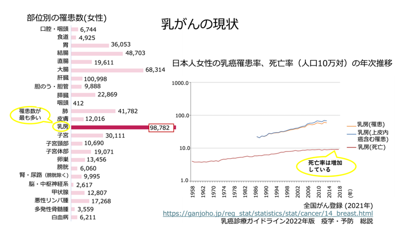 図1.乳がんの罹患数と死亡率の推移 2021年の統計では女性のがん罹患の中で最も多く、死亡率は増加傾向にあります。