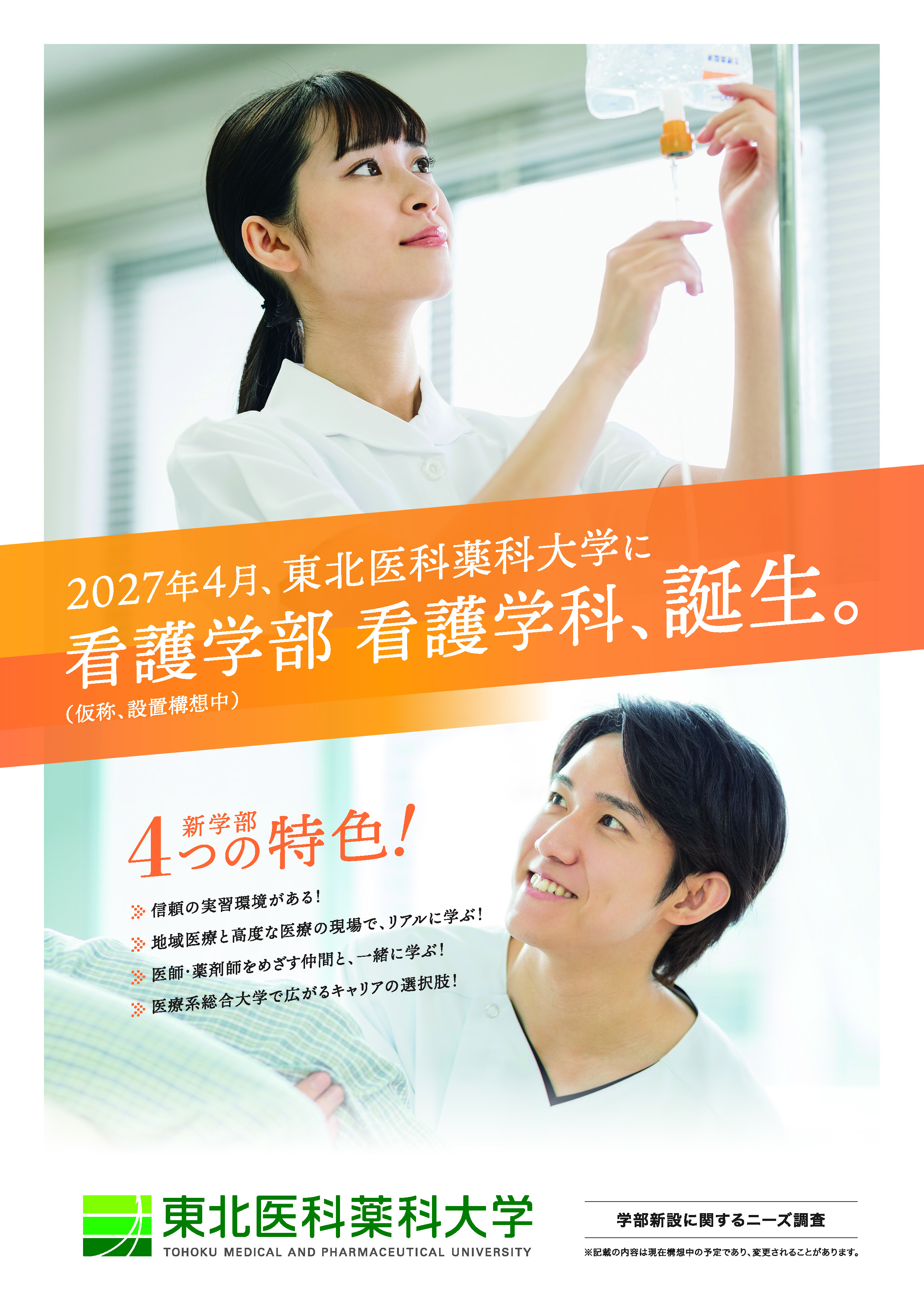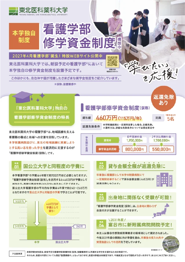本学は1939年の創設以来、医療系総合大学として薬学部、医学部および附属病院が連携し、高度かつ専門的な能力を持つ数多くの人材を地域に輩出してきました。 こうした薬学・医学教育の実績をもとに、地域医療の中心的な役割を担う看護職を育成するため、東北医科薬科大学は2027年度に看護学部看護学科を開設します。