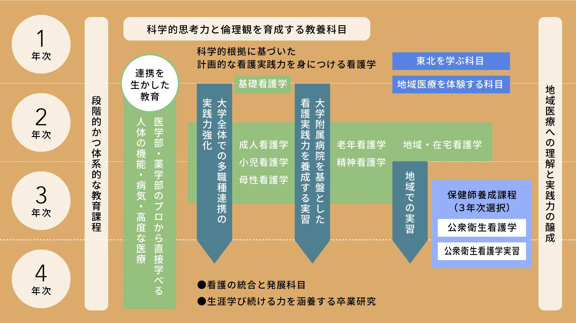 医療系総合大学である強みを生かし、 看護学部・医学部・薬学部 と連携した教育を通じて、基礎的な知識を修得し、看護職としての役割を主体的に果たす実践力を養うことで、東北地域の医療を支え、東北の未来を支えていきます。