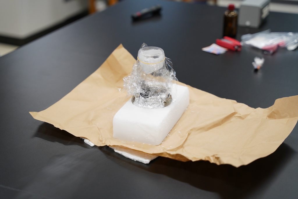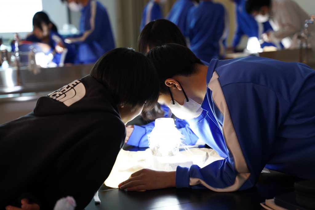 薬学部 放射薬品学教室 山本 由美 講師を先生として、プラスチックカップやアルミホイルを使って霧箱を作り、自然界に存在する放射線を観察しました。また、バナナやラドン温泉成分入り入浴剤を入れた後の変化についても実験していました。参加した生徒さんたちは、様々なかたちをした放射線を見つけようと、一生懸命実験に取り組んでいました。授業用タブレットを使い、放射線の動画をうまく撮影することができた班からは、歓声が上がっていました。