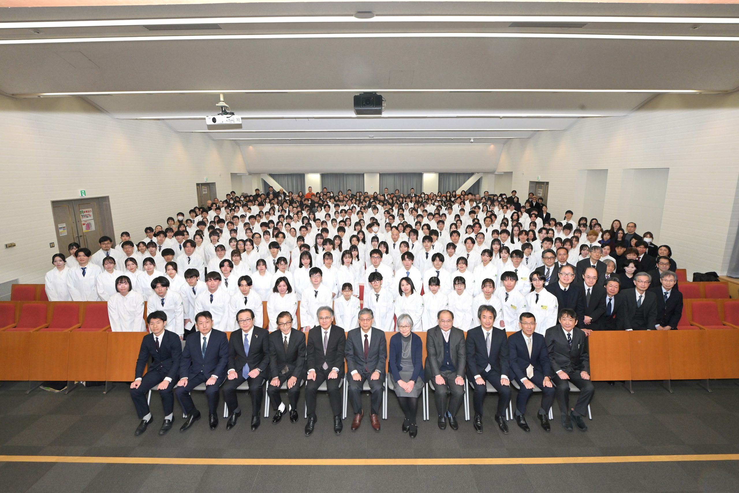 令和8年1月28日(水)、小松島キャンパス講義棟において、薬学科新5年次生を対象に白衣授与式を開催しました。この式典は本学の学生が臨床実習に就くに当たり、薬剤師を目指す者としての自覚を促すものです。式典では大野学長ならびに村井薬学部長から激励のお言葉をいただき、実習生代表2名に本学のロゴ・大学名が入った白衣が手渡されました。また、8年目となる今年、初めて保護者の皆様にもご参列いただき、ともに学生の門出をお祝いいただきました。