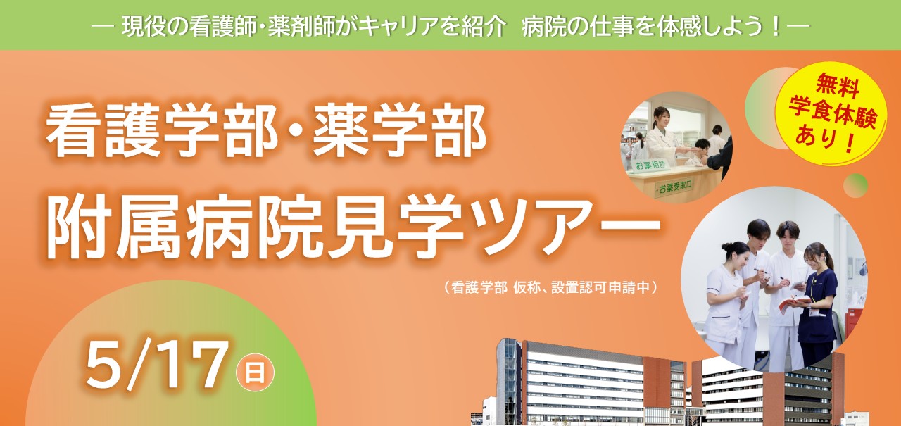 「看護学部ってどんな風に学ぶんだろう?」「大学の附属病院で薬剤師として働くってどんな雰囲気?」そんな疑問を持つ高校生のみなさんへ、本学では看護系または薬学系の進路を考える高校生のために 「看護学部・薬学部 附属病院見学ツアー」 を開催します!