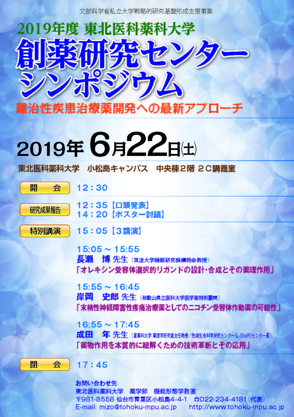 来る2019年6月22日(土)12:30から、文部科学省選定私立大学戦略的研究基盤形成事業「アンメット・メディカル・ニーズに応える創薬基盤研究の推進および臨床応用への展開」の「2019年度東北医科薬科大学創薬研究センターシンポジウムを開催致します。