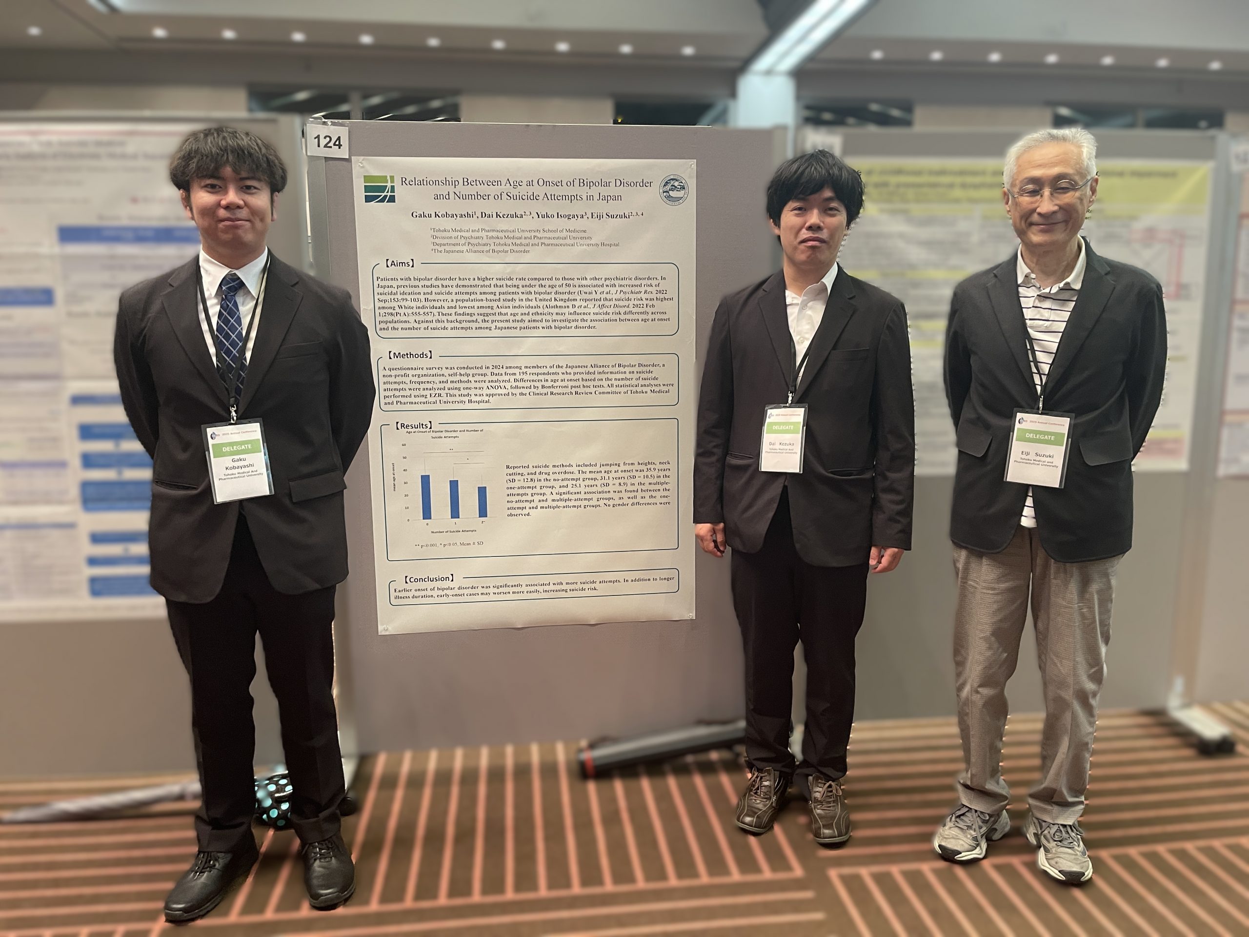 2025年9月17日から19日まで幕張メッセで第27回国際双極症学会(ISBD)の学術集会が開催され、本学医学部4年生の小林 楽さんが「Relationship Between Age at Onset of Bipolar Disorder and Number of Suicide Attempts in Japan (双極症患者における発症時年齢と自殺企図回数の関係)」のタイトルで発表しました。精神科学教室の鈴木映二先生、毛塚大先生の指導のもと、3年時に行った課題研究の延長として行った研究です。