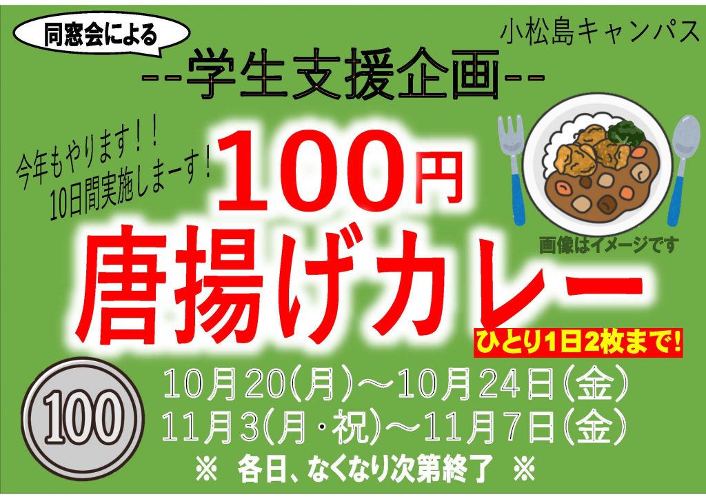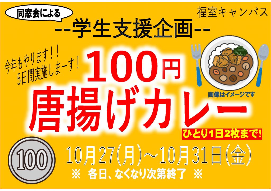 同窓会支援金により、今年も100円カレーを提供します。唐揚げと温野菜トッピングでボリューム満点!数量限定で売り切れ次第終了のため、ひとり1日2枚までとします。ぜひお越しください! ※在学生のみ対象です。