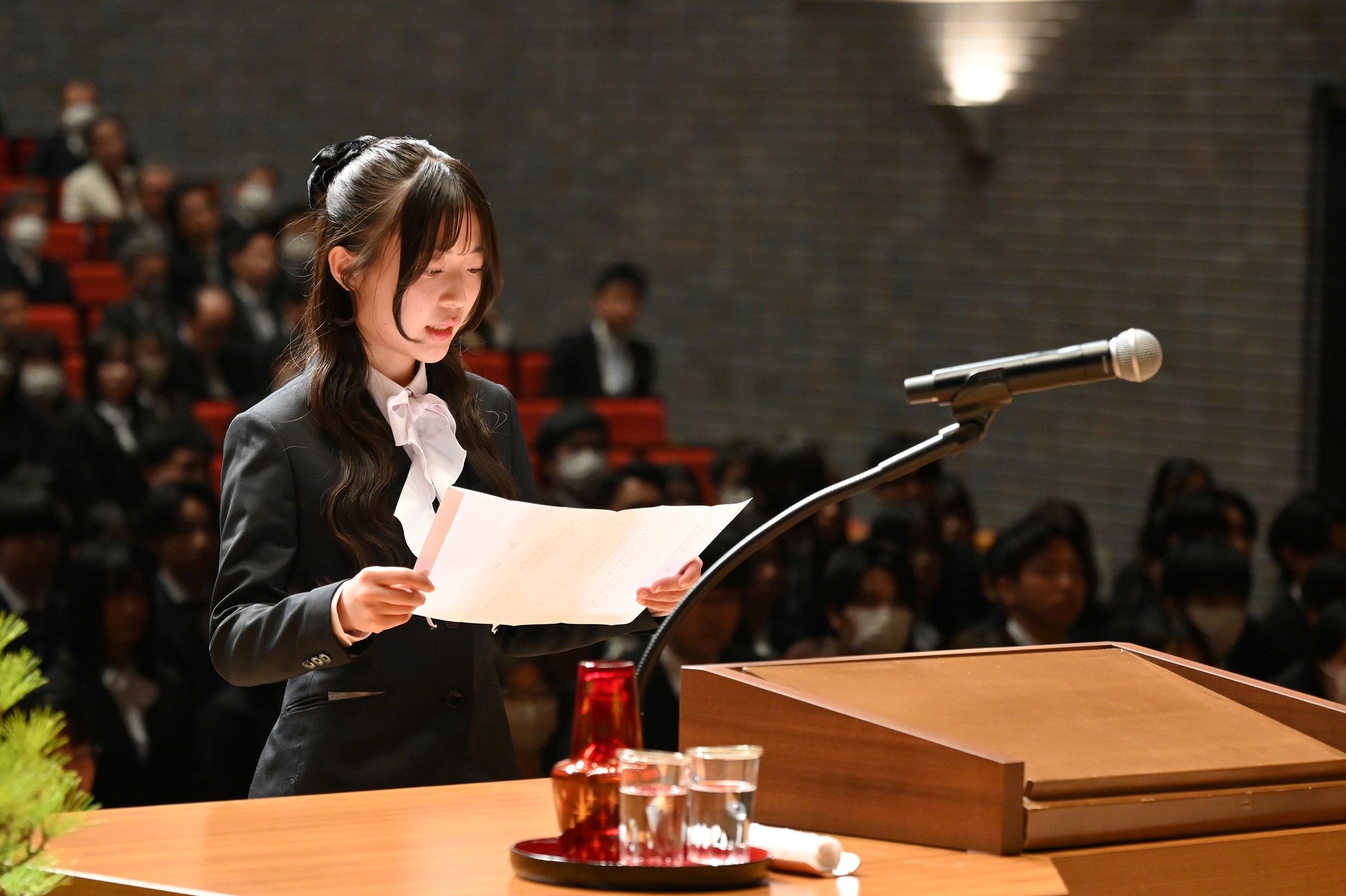 新入生の宣誓では、代表して薬学科の工藤姫夏さんが壇上にあがり、「本学学則を堅くまもり人格の陶冶につとめ学業に専心することを誓います」との宣誓を行いました。