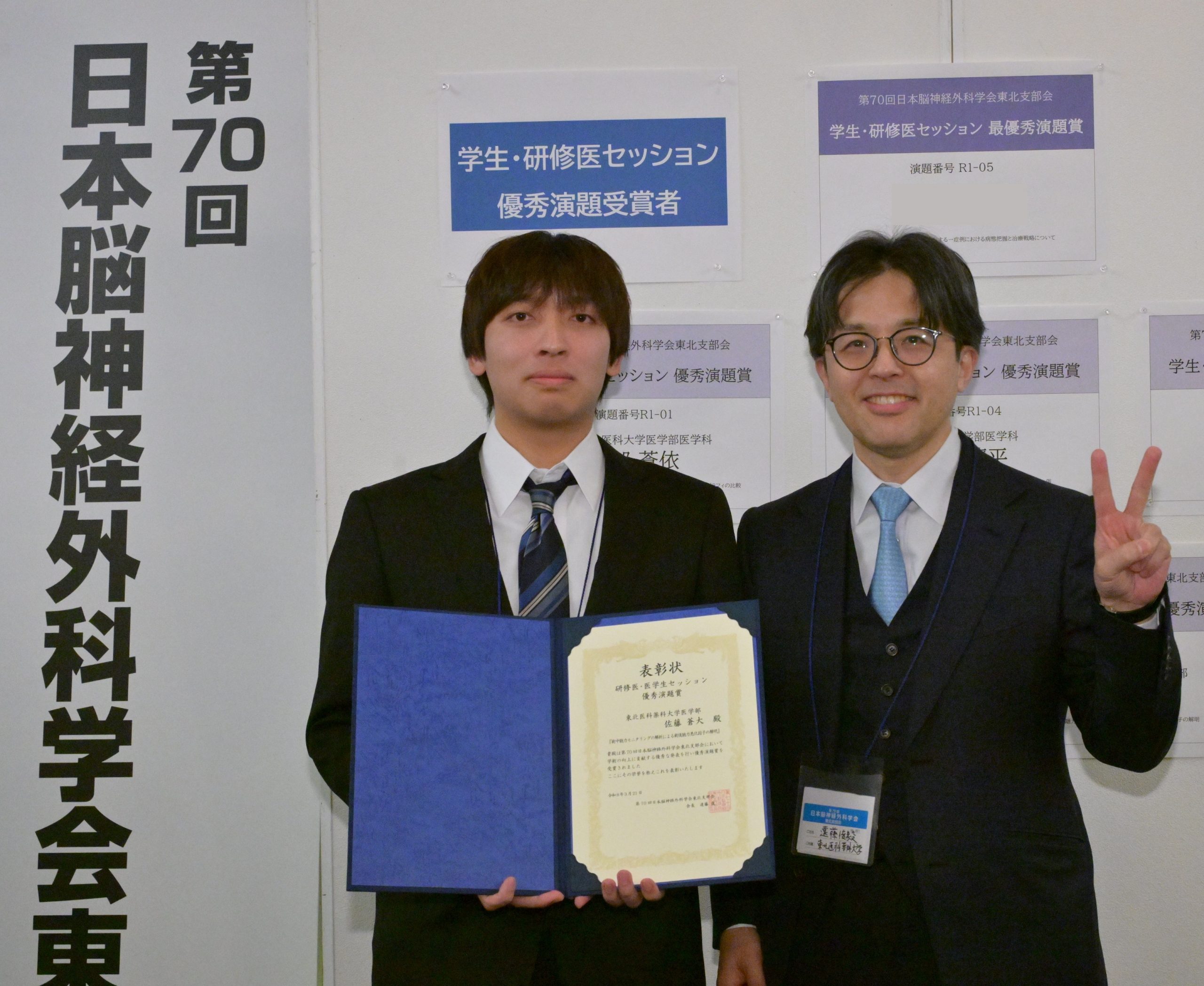 医学科3年の佐藤蒼大さんが、2026年3月21日に開催された第70回日本脳神経外科学会東北支部会において、学生・研修医セッションで優秀賞を受賞しました。本発表は、課題研究期間中に同級生の江面梨瀬さんと協力して取り組んだ内容です。